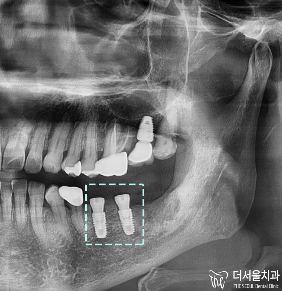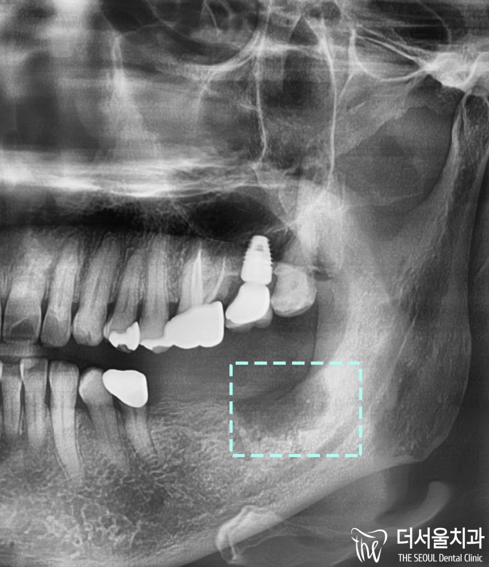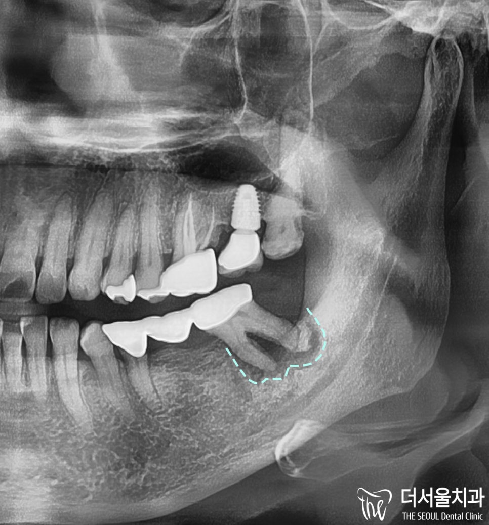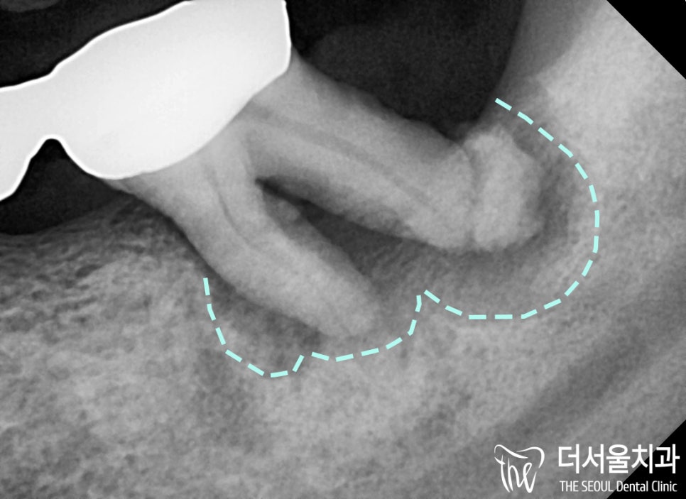 어금니 뿌리 주변이 녹은 것을 확인할 수 있으며