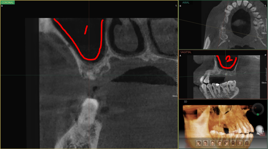 1번 및 2번, coronal plane 및 sagittal plane 에서 뼈가 상당히 얇음을 보여줍니다.