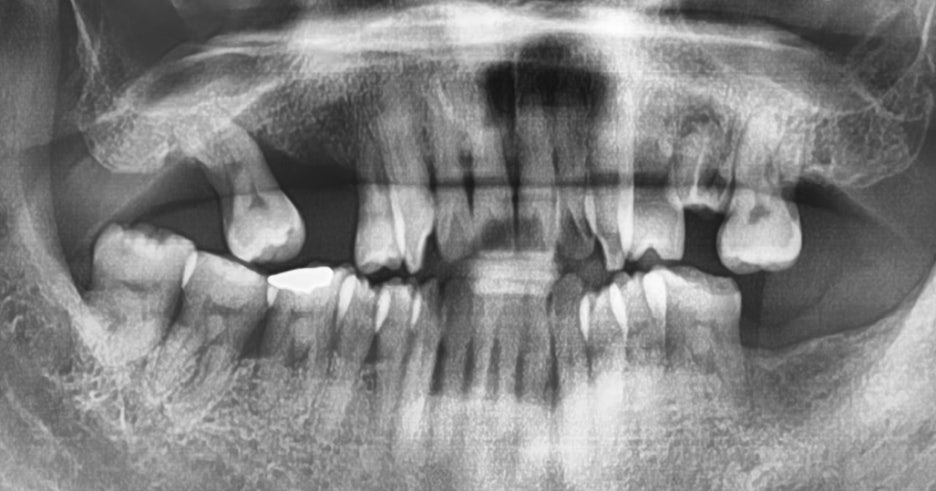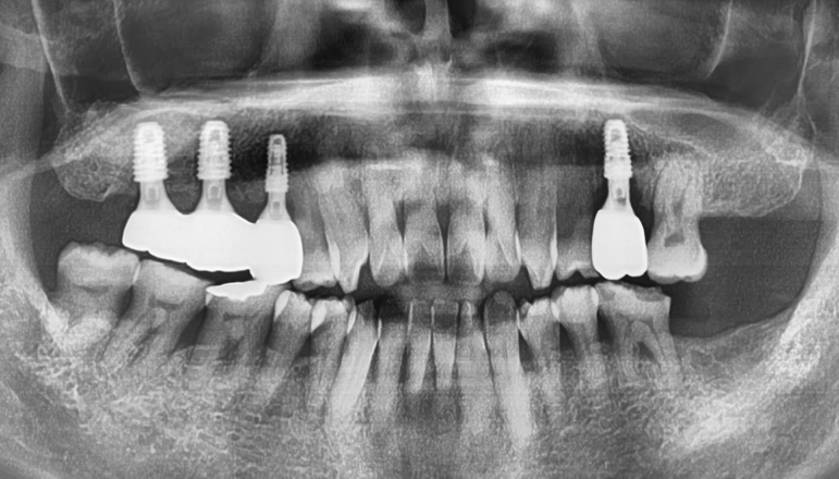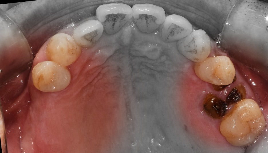 한 쪽에는 뿌리만 남아있는 치아, 그리고 다른 곳에는 아예 치아들이 없는 상태입니다.