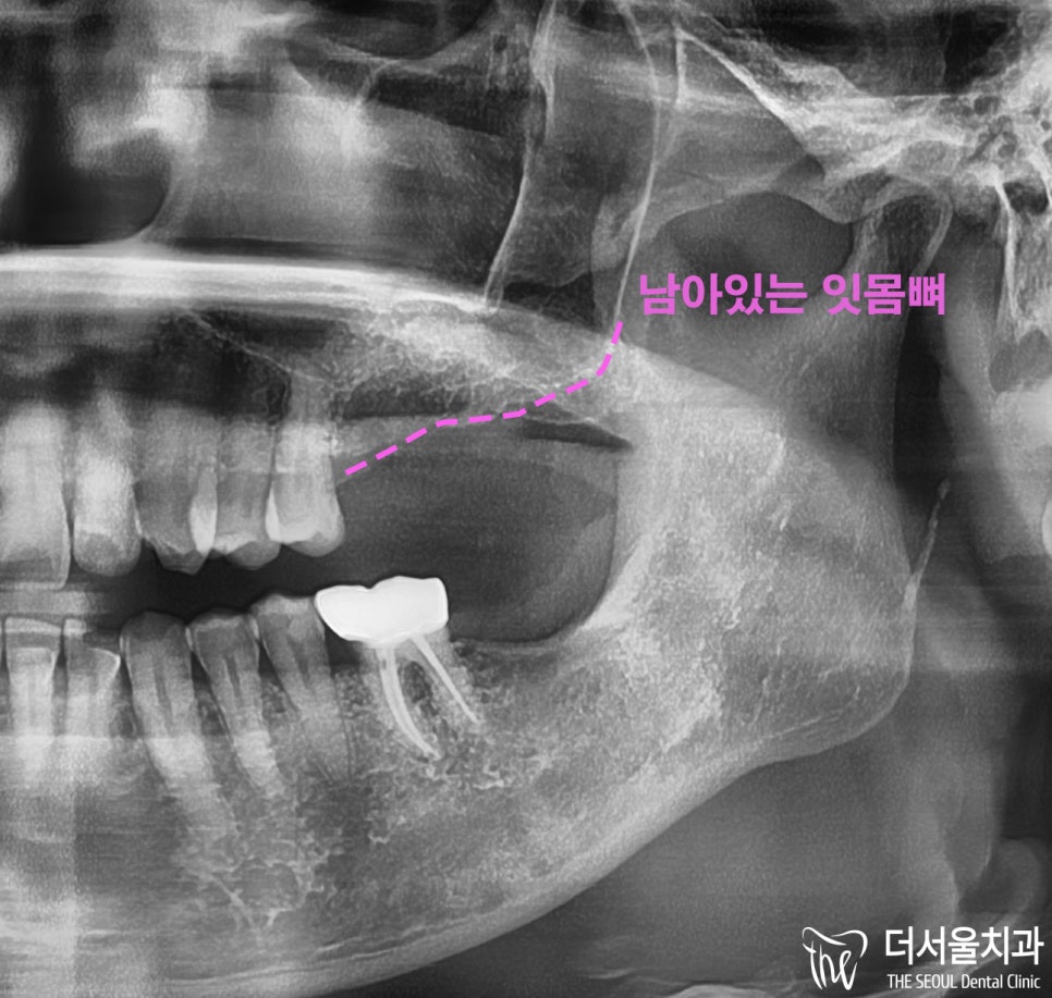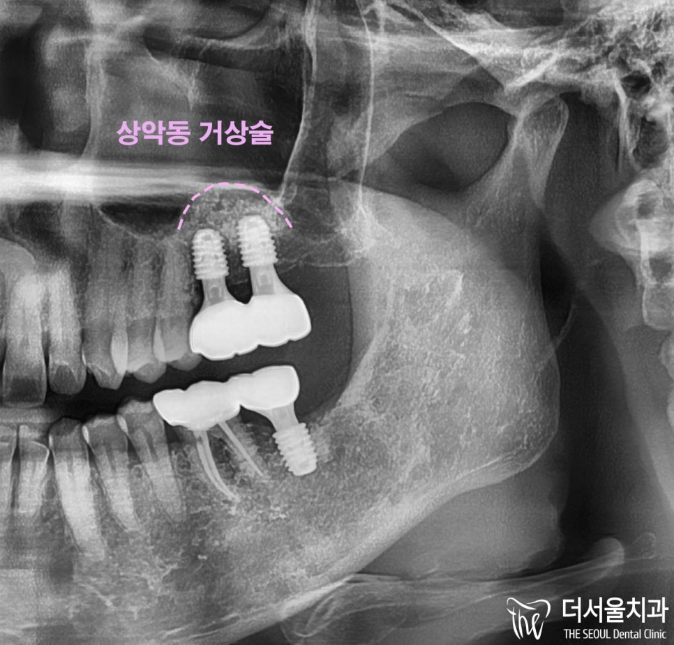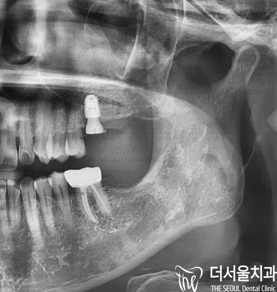 하얗게 뼈이식재가 비쳐 보이는 것을 볼 수 있으며,