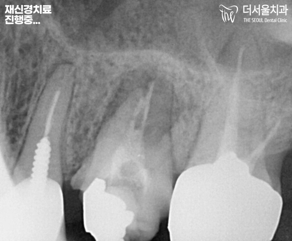 재신경치료로 여러번 근관을 소독하고