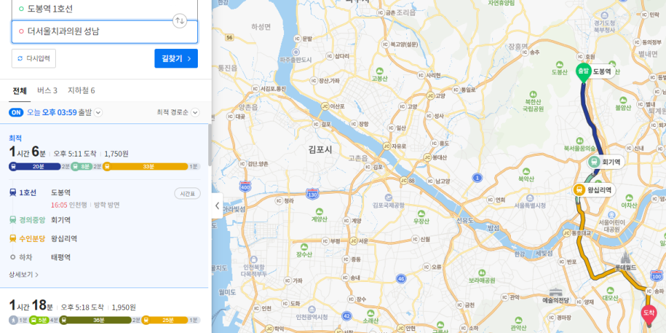 그런데 지하철은 2번 갈아타야 된다는 점에 있어