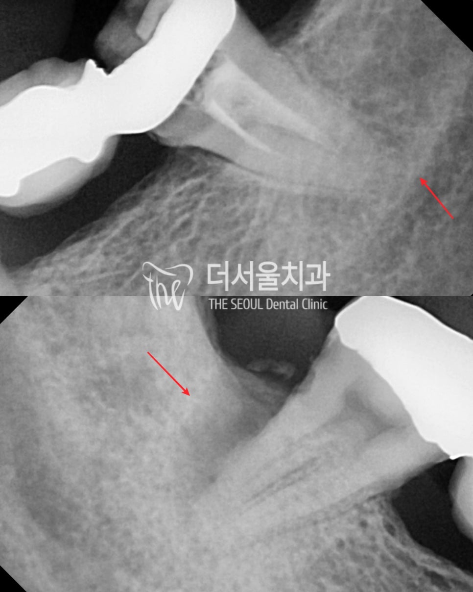 내려앉아 치아뿌리를 거의 잡아주지 못하고 있어